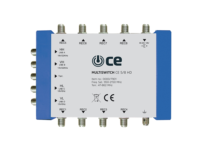Distribuce signálu ze dvou satelitních pozic (2 x 4 polarizace) a DVB-T2 až pro 8 účastníků