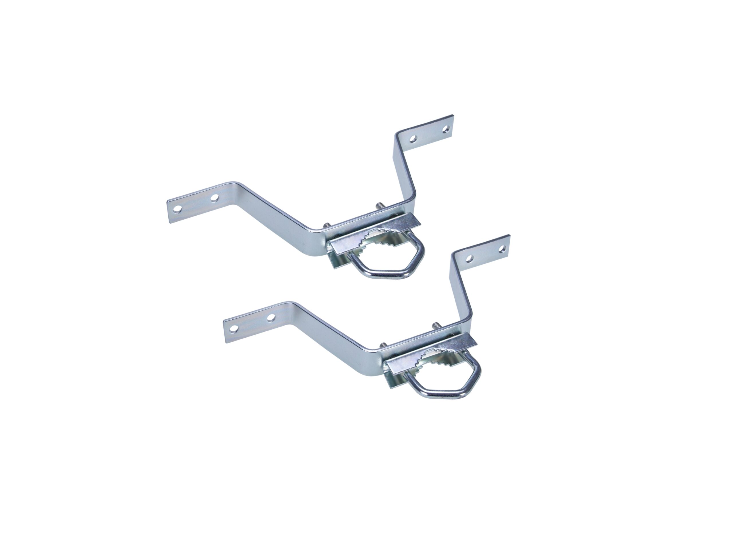 Upevnění/držák stožáru z galvanicky pozinkované oceli. Sada obsahuje dvě spony. Upevnění umožňuje montáž hliníkových a ocelových stožárů do průměru 50 mm na fasádu objektu (římsy, okapu, krytiny).